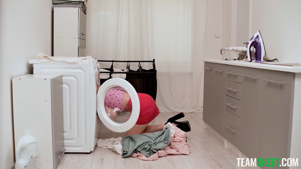 In this debut scene for Lily Blossom, “Fuck Me Outta Here!” from TeamSkeet’s “I Made Porn” series, we’re treated to a ridiculously hot and unexpected encounter between roommates. The setup is ingenious: Lily, a stunning Russian teen, gets stuck in the washing machine, and her roommate, Brad Knight, has to come to her rescue.